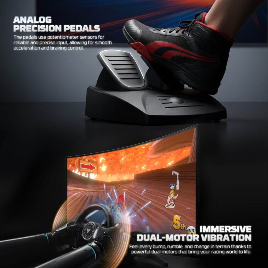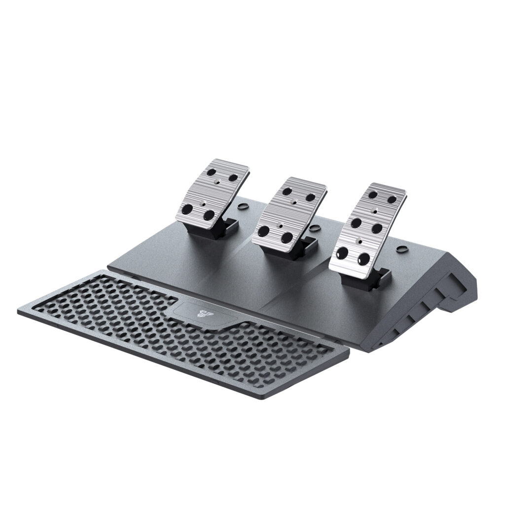 Incluye volante, pedalera Hall Effect (acelerador, freno y embrague) y un shifter H real de 6 velocidades + retroceso.