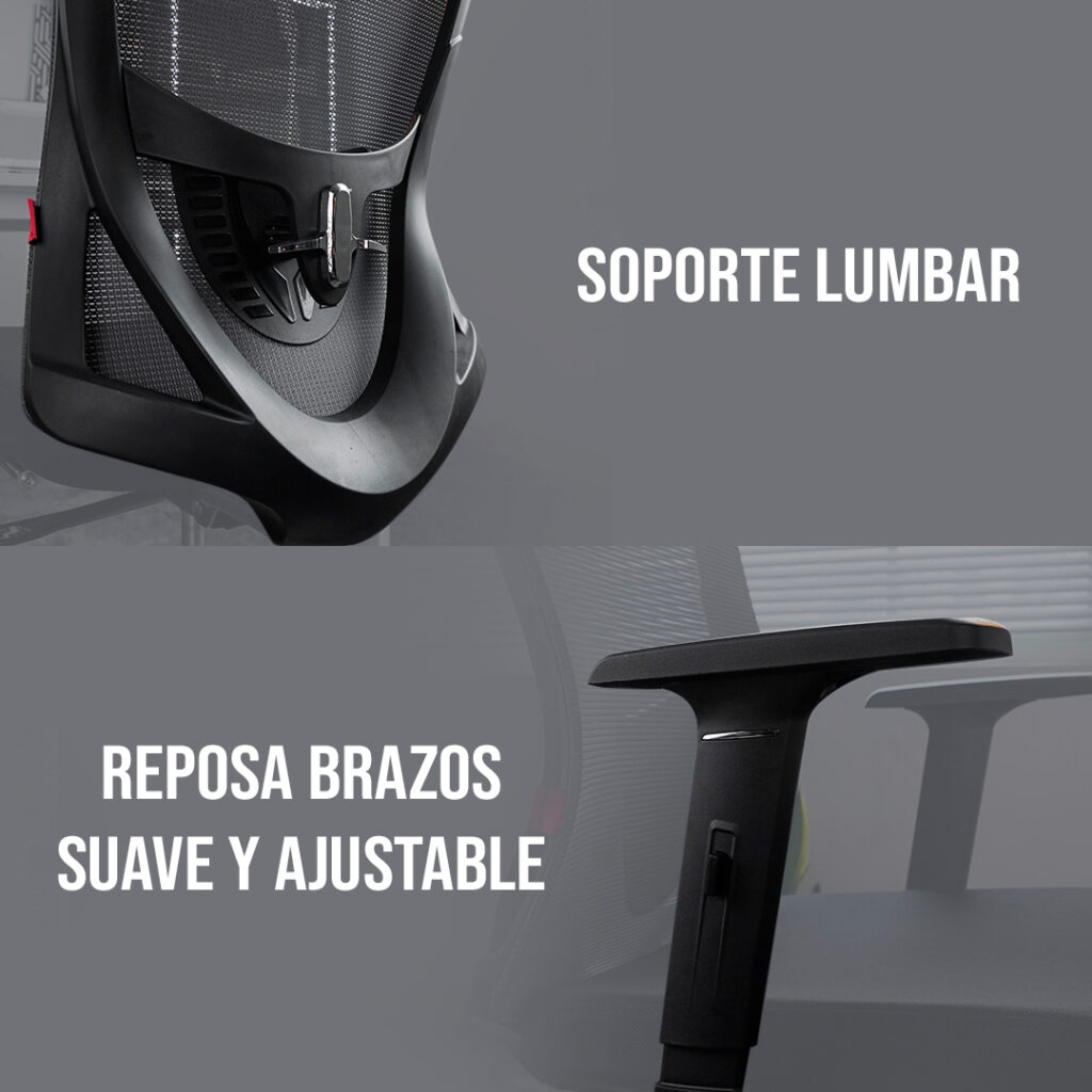 - 🔙 Apoyo lumbar integrado, favorece una postura saludable y reduce la fatiga